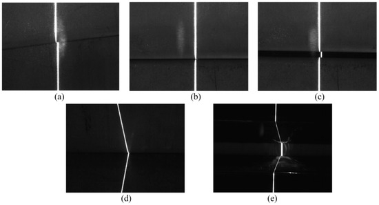 Weld joint images with laser stripe: (a) lap weld joint, (b) butt weld joint, (c) splice weld joint, (d) fillet weld joint, and (e) v-type weld joint.