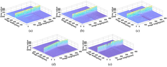 As described above, weld joint identification is performed in L2, and it is the basis of L3 and L4. In the real weld site, the weld joint type generally does not change during one-time tracking; thus, the weld joint type needs to be recognized only at the initial stage L2. In this paper, we consider the recognition of only 40 weld joint images that were captured by the camera in the first second of the welding process. There is no spatter in the joint images at this time. Therefore, we only need to consider the reflection and scattering from the weld surface. This simplification can effectively reduce the difficulty of noise processing and improve the response speed of the system. In this paper, a hybrid filtering algorithm that consists of median filtering with a 5 × 5 square template and an open operation with a 3 × 7 rectangular template is used to remove noise from the weld joint images. Figure 8a,b show the results of image noise processing of Figure 4e. Subsequently, we perform a threshold binary operation to the noise with a grey value below 220. The laser stripe forms clusters in the image and the weld joint positions in each frame are different. Therefore, we extract the laser curve in the image to determine the position of the laser stripe based on the grey centroid method in this paper. This process can be expressed, as follows: