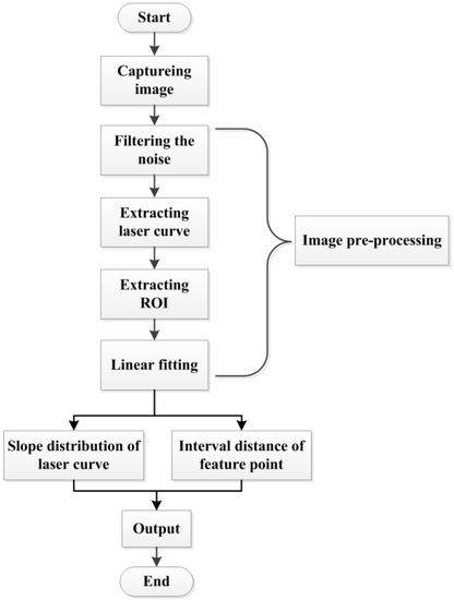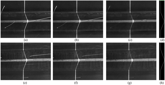 where Si represents the slope of the ith fit line and mi and ni denote the endpoints of the interrupted laser curve in the image. The disconnected curves can be determined by row scanning. Figure 8e shows the line fitting results.