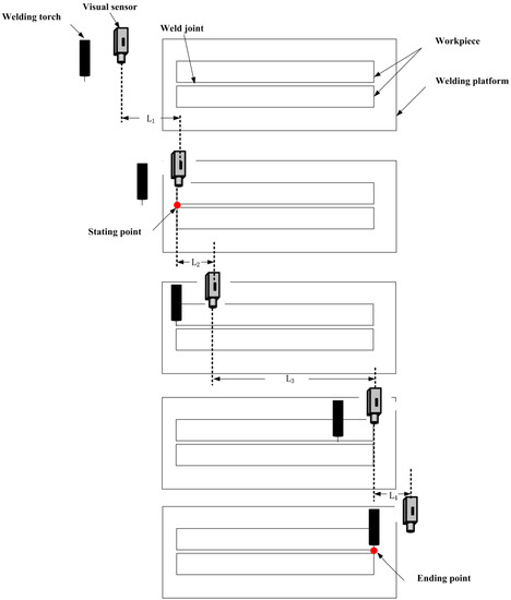 As shown in Figure 7, regarding the relative position of the visual sensor, the welding torch and the workpiece, the welding process is divided into four stages: