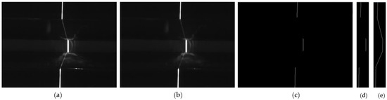 (a,b) Image noise processing result of Figure 4e, (c) laser curve, (d) region of interest (ROI), and (e) laser curve fitting.