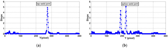 Figure 10a,b show the final laser curves slope distributions of the lap weld joint and splice weld joint images. On this basis, the laser curve slope feature can be defined as Equation (8).