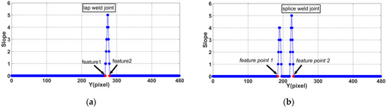 As shown in Figure 11, the slope of the laser curve changes only at the edge of the weld joint. Therefore, in this paper, feature point 1 is defined as the first pixel point at which the slope is greater than 1 and feature point 2 is defined as the last pixel point at which the slope is greater than 1, as follows:
