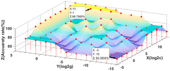 To optimize the parameters, the feature vectors were first normalized to facilitate fast convergence. Subsequently, the parameter set was selected by using the grid search method that is based on five-fold cross-validation. The training samples were divided into five groups. Four groups were treated as the training data each time, and the remaining group was used as the test data. Afterwards, the average five-fold cross-validation accuracy was obtained by averaging the results that were obtained in this way for each set of parameters. Figure 16 shows the results that were obtained for 110 sets of parameters via the cross-validation approach. These results show that when log2C is equal to −5 and log2g is equal to −15, i.e., C = 0.03125 and g = 0.00003, the accuracy that is determined via cross-validation is the lowest, with a value of 62.3834%. When log2C is equal to 13 and log2g is equal to 1, i.e., C = 8192 and g = 2, the accuracy determined via cross-validation is the highest, 98.7565%. Therefore, C = 8192 and g = 2 were used as the parameter settings for model training to establish the weld joint classification model.