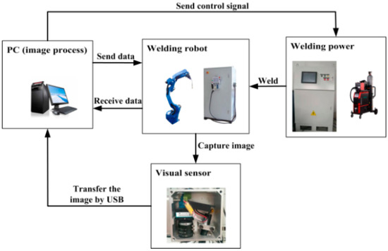 A visual sensor is installed on the end effector of the robot. For communication, there are cable connections between the auxiliary welding equipment and the robot controller, between the computer and the robot controller, and between the robot controller and the welding robot, and the visual sensor transmits image data to the computer through a USB connection.