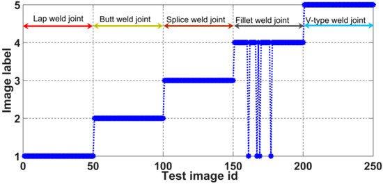 For this analysis, 600 weld joint images, including 120 images for each type of joint, were selected as the training images. A total of 250 weld joint images were selected for testing: images 1–50 were images of lap weld joints, labelled with a value of 1; images 51–100 were the images of butt weld joints, labelled as 2; images 101–150 were images of splice weld joints, labelled as 3; images 151–200 were images of fillet weld joints, labelled as 4; and, images 201–250 were images of v-type weld joints, labelled as 5. All of the experiments that were reported in this paper were performed on a computer with an Intel i5-6500 CPU, with a main frequency of 3.2 GHz and 8 GB of RAM.