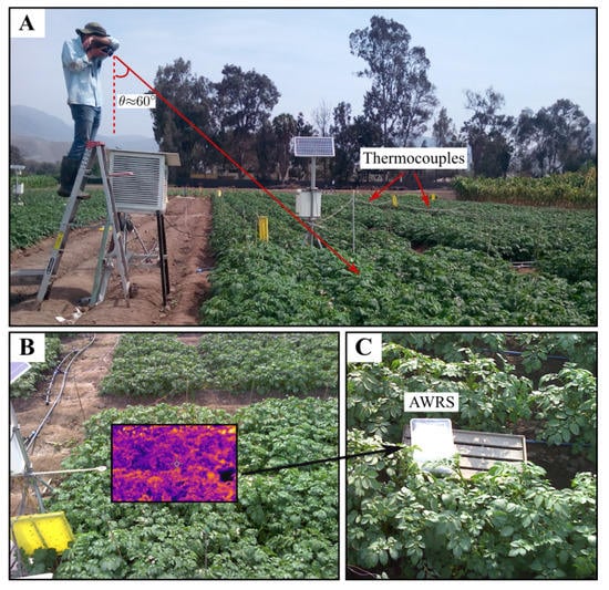 The relationship between water contents in the plant and yield has been well established [1,2]. The use of standardized parameters based on physiological thresholds that lead to photosynthetic impairment if surpassed have been successfully used [3,4,5,6]. Nevertheless, assessing the water status of a few leaves seldom represents the water status of the field, and thus irrigation decisions would benefit from noninvasive and nondestructive methods covering larger ranges [7,8]. The use of remote sensing for assessing plant water status on different scales, providing near real-time assessments, might become an adequate option. Notwithstanding, the approach has to be tested under field conditions with crops sensitive to water deficiency. Potato (Solanum tuberosum L.)—considered to be the third most prevalent edible crop in production after wheat and rice [9]—was used as an example. Its sensitivity to water scarcity (highly associated with a shallow root system) [10] and its cultivation in drought-prone zones caused by climate change [11] are the drivers spurring research to find ways to maximize potato yields while reducing water resources. The use of physiological thresholds has contributed to this goal; thus, Ramírez et al. [6] recommend keeping leaves at maximum stomatal conductance (associated with leaf pore openness and gas exchange) at saturated light >0.15 mol H2O m−2 s−1 to guarantee appropriate tuber yield whilst saving water. However, the use of this kind of physiological traits for water status inspection requires expensive, exhaustive, invasive, yet microscale (leaf) assessments. Thus, infrared thermography is seen as a promising technology that can detect variations in the canopy temperature (), and ultimately, estimate the crop water stress index (CWSI), an indicator highly correlated with stomatal conductance [6,8,12] (see Section 2.4 for further details).