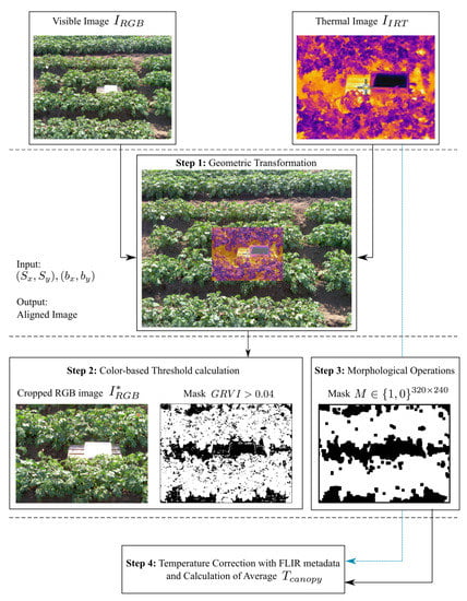 The proposed methodology to align the RGB and IRT images, extract the canopy area, and calculate the average temperature of the potato canopy in the scene is depicted in Figure 2. For this, let the RGB visible image be defined as and the IRT image as , where = pixels and = pixels are their resolutions, respectively.