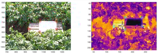 Figure 3. Manually selected, spatially correlated control points in both RGB and IRT images to estimate the geometric transformation parameters: scaling factors () and displacement vector (). - Color-Based Threshold Calculation: The green–red vegetation index (GRVI) is used to determine the presence of the potato canopy in the scene. As was thoroughly explained and assessed in [31], GRVI can serve as a threshold to determine the leaves’ location in an RGB image. After the geometric transformation procedure is performed, the overlapped region from the scaled RGB image is extracted; it is referred as from now on. Then, the GRVI is calculated for each pixel () using the following equation:where indicates the pixel located at the 2D coordinate in the layer (, and ). In [31], a value of = 0 can detect the early phase of leaf green-up over several forest species, such as deciduous broadleaf and deciduous coniferous, as well as grassland and a rice paddy field. In this study, additional experiments were conducted with the potato canopy, and it was found that a threshold value of can determine the presence of the potato canopy with a high level of accuracy when it is not affected by the crop senescence. Finally, the logical mask is generated and contains 1s when a given pixel yields a and 0 s otherwise.