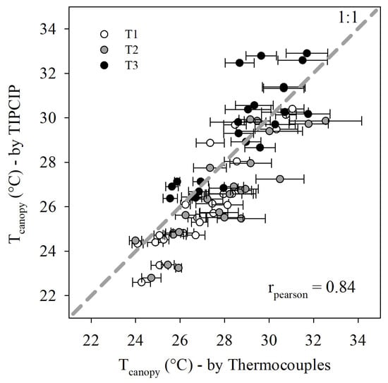 Scatter plot (±standard error) of canopy temperatures () acquired by thermocouples (x-axis) and infrared thermal images, which were processed with the Thermal Images Processor (TIPCIP) software (y-axis) under three irrigation treatments: T1 (control or fully irrigated), T2 (crop water stress index (CWSI) < 0.4), and T3 (CWSI < 0.7). The 1:1 dashed line (x = y) is plotted as a reference. These data were collected in the first experiment (E1). : Pearson correlation coefficient.
