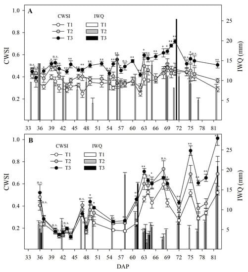Average value (± standard error) of crop water stress index (CWSI, line chart) measured before irrigation treatments, and irrigated water quantity (IWQ, bar chart) for the first (A) and second (B) experiment for the three irrigation treatments: T1 (control or full irrigation), T2 (CWSI < 0.4), and T3 (CWSI < 0.7). The terms **, *, and n.s. indicate , , and (not significant), respectively, in the ANOVA. DAP—Days after planting.