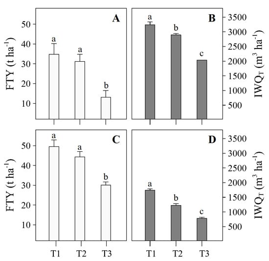 During E1, 14, 9, and 1 irrigation treatments of between 4 and 14 mm, 5 and 16 mm, and 25 mm (Figure 5A) were established for T1, T2, and T3, respectively. The maximum average value of IWQT and FTY in this trial were 3238.7 ± 95.80 m3 ha−1 and 38.9 ± 5.94 t ha−1 corresponding to T1 (Figure 6A,B) with no significant (p-value > 0.05) reduction in FTY with T2 of 34.5 ± 3.72 t ha−1, which showed a −10.5% decrease in IWQT. T3 significantly (p-value < 0.05) reduced by −37.2% and −61.4% the IWQT and FTY, respectively, in comparison to T1 (Figure 6A,B). During E2, 17, 10, and 4 irrigation treatements of between 1.7 and 9.2 mm, 3.7 and 18.7 mm, and 3.7 and 16.5 mm (Figure 5B) were established for T1, T2, and T3, respectively. The maximum average value of IWQT and FTY in this trial was 1738.5 ± 44.35 m3 ha−1 and 49.5 ± 3.37 t ha−1 achieved by T1. T2 showed a no significant (p-value > 0.05) reduction in FTY in comparison to T1 of 44.3 ± 2.66 t ha−1, but showed a significant −29.7% (p-value < 0.05) reduction in IWQT (Figure 6C,D). T3 significantly (p-value < 0.05) reduced by −55.0% and −39.2% in terms of the IWQT and FTY, respectively, in comparison to T1 (Figure 6C,D).