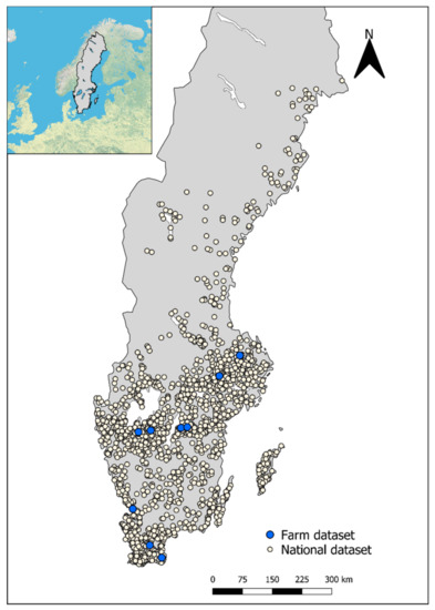 Map of Sweden showing soil sampling locations used in the present study. Farm dataset refers to the nine farms that were used for independent validation of the models. National dataset refers to the calibration samples. Base map courtesy of Environmental Systems Research Institute (ESRI) (Redlands, CA, USA).