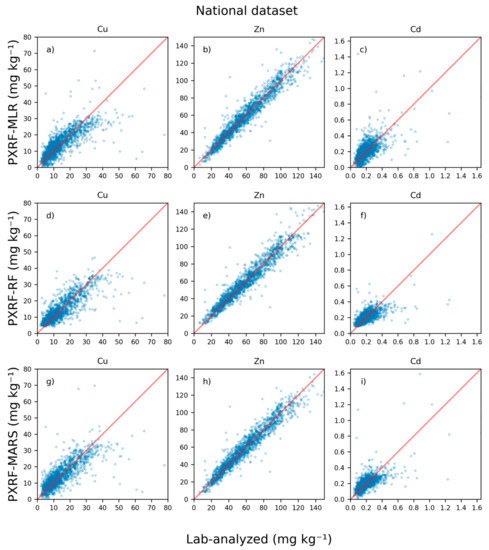 Concentrations of copper (Cu), zinc (Zn), and cadmium (Cd) predicted from portable X-ray fluorescence (PXRF) measurements using multiple linear regression (MLR), random forest regression (RF), and multivariate adaptive regression splines (MARS) for national-scale data using leave-one-out cross-validation compared with 7M HNO3 extraction and inductively coupled (ICP) analysis. The symbols are semi-transparent to show point density.