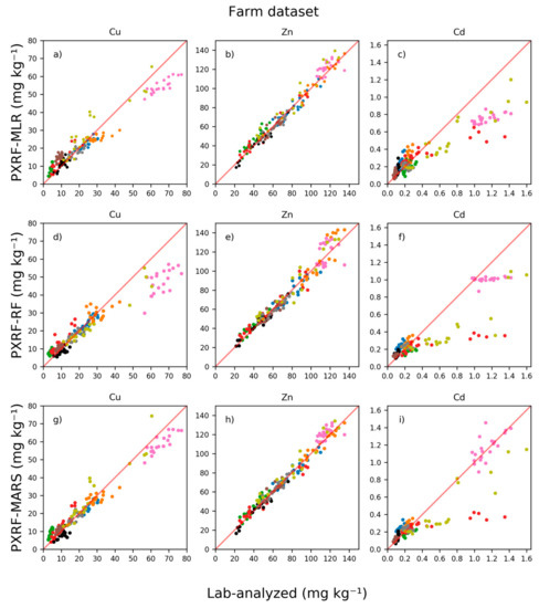 Concentrations of copper (Cu), zinc (Zn), and cadmium (Cd) predicted from portable X-ray fluorescence (PXRF) measurements using multiple linear regression (MLR), random forest regression (RF), and multivariate adaptive regression splines (MARS) on the farm dataset compared with 7M HNO3 extraction and inductively coupled (ICP) analysis. The models were calibrated at the national scale and applied on the farm dataset. Each color represents a specific farm.