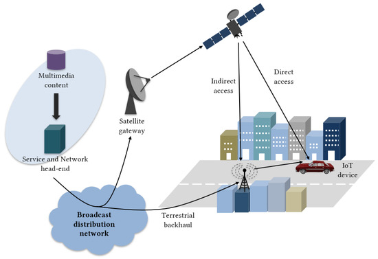 The indirect access is particularly relevant for Internet of Things (IoT) applications. This is easy to understand if we think that most IoT end-devices lack the ability to communicate directly with a satellite, as it would dramatically increase their cost and power consumption. Just to cite one illustrative example, an eye-catching satellite backhaul-based IoT network is discussed in [5,10]. This contribution develops the idea of using low altitude drones and unmanned aerial vehicles (UAVs) as IoT gateways that collect the data provided by all the short-range IoT devices spread in the area. Satellites are then used to connect the UAVs to the main Internet backbone, which can be seen as a paradigmatic “comms on the move” application [11]. Note the pilot experiment carried out in the Rwandan capital of Kigali, where the Inmarsat consortium is deploying a network of LoRa-based IoT devices (such as sensors in water resources) [12], using exclusively satellite communication as the backhaul. In addition to illustrating the concept, the project will serve as a blueprint for the quick development of smart cities in areas where the terrestrial 5G infrastructures are not mature enough or need to be complemented (e.g., in temporary deployments for massive public events).