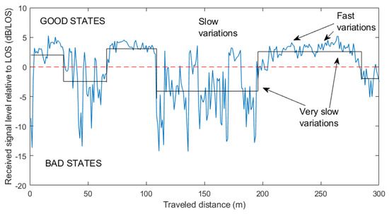 Measured signal level (S-Band) relative to LOS in an urban environment. Very slow variations are modeled by two states: GOOD and BAD.