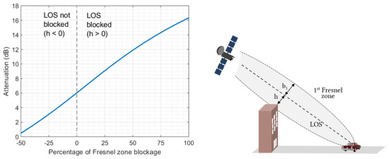 Left: Attenuation of the signal due to building diffraction as a function of the percentage of the first Fresnel zone obstruction. Negative values correspond to a situation where LOS is not blocked. Right: Depiction of Fresnel clearance distance h and the cross-sectional radius of the first Fresnel zone .