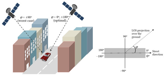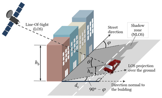 Figure 4 depicts a generic scenario of a street and several buildings of different heights blocking the Line-Of-Sight from the satellite. We define the “shadow zone” as the area projected over the street that establishes the boundary between LOS and NLOS situations. This approach corresponds to a zero Fresnel zone clearance situation, similar to the MKFs [33], meaning that the distance between the building and the Line-Of-Sight from the user to the satellite is zero.
