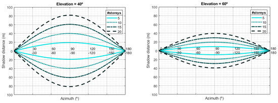 Example of shadow distance calculation as a function of the number of storeys and the street orientation (azimuth angle of the street relative to satellite LOS direction) considering two different elevation angles of the satellite.