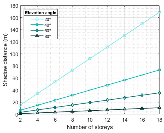 If we take 3.5 m as the typical height of the storey of each building [46] and, to fix ideas, 1.5 m as the typical height of a mobile terminal above ground level, we can approximately calculate the shadow distance as a function of the number of storeys of a building; the satellite elevation angle, ; and the street orientation, , as it is depicted in Figure 6. Observe that the larger the elevation angle, the smaller the shadow zone. For LEO satellites, the elevation angle changes with time: it starts out very small, and then increases until the satellite is almost vertical to the ground. Then, it decreases until the satellite disappears behind the horizon. The statistical distribution of the angles is approximately exponential [47]. The combination of the elevation angle distribution and shadow lengths readily provides the distribution of the ON/OFF states for a given street width. Complementary, Figure 7 represents the shadow distance as a function of the number of storeys for different elevation angles in the worst situation (street perpendicular to satellite direction). For small elevation angles () the shadow distance becomes really large even for low buildings, which would probably result in a total blockage situation in that location.