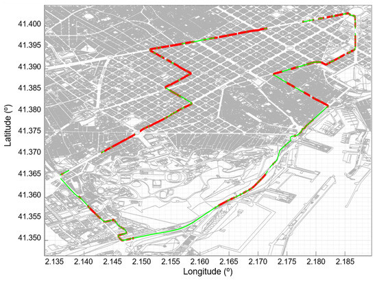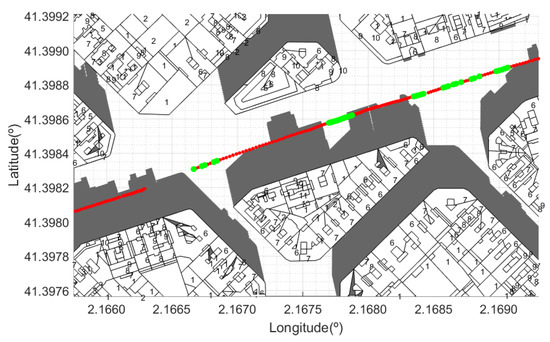 Path along which the measurements were taken, corresponding to the urban area of Barcelona. The locations where the signal exceeded/did not exceed the LOS level are shown in green/red color, respectively. There are some fragments of the path that appear without any mark because the measurements were unreliable. The apparent overlap of red and green dots is due to the scale of representation and the proximity of the measurement locations.
