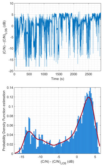 Measured carrier-to-noise ratio (C/N) relative to LOS along the route in the urban area of Barcelona, as a function of time (top) and estimated probability density function of the data (bottom).