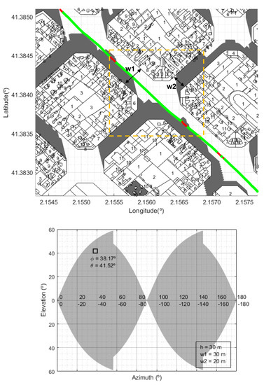 Scenario 1: Example of the shadow zones predicted for a real scenario in Barcelona where almost all the measures recorded were above the LOS level (green points). However, the MKF that corresponds to the street crossing bounded by the dashed line predict no coverage. average building height; w1, w2 = average streets widths; , are, respectively, the azimuth and elevation angles of the wider street relative to direction of the satellite.