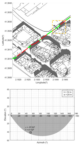 Alternatively, in [27,28,33], an approximate methodology based on street-masking functions (MKFs) for urban areas is presented. The MKFs indicate the azimuth and elevation angles for which a satellite is visible from the user terminal’s location. Functions of this type have often been obtained by means of photogrametric studies and ray-tracing. Alternatively, realistic environments can be also modeled by creating virtual scenarios using observed distributions of building heights, widths, spacings, etc. [21]. A simplified version of the MKF concept, which yields an approximate evaluation of the availability of the satellite signal, can be derived when the contribution of the reflected and diffracted components is disregarded. In this case, MKFs can be calculated according to basic geometrical considerations for a limited number of standard scenarios, where only a minimal knowledge of the urban structure (generic street widths and the average building height) is required. For example, in simple situations (e.g., street canyons, street crossings, T-junctions, or single walls) the MKFs are defined by generic relationships such as the following one [33]: