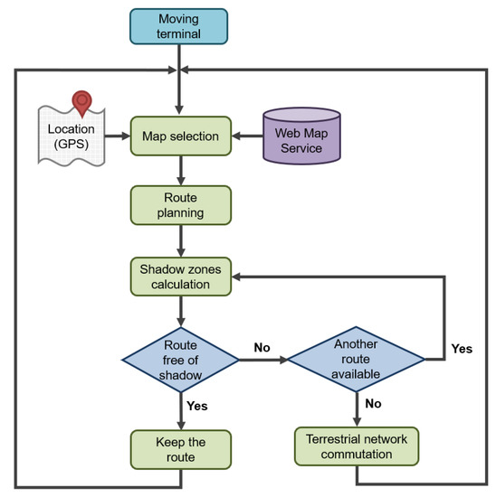 Furthermore, it also follows that the gateway should have the capacity to store the data received from the devices while moving outside of the satellite’s communication range to prevent data loss (and vice versa, messages from the satellite must also be stored until it is possible to transmit them to the device, e.g., when the receive windows are open). In the end, the satellite IoT gateway should be endowed with store-and-forward characteristics to overcome the link interruptions and provide end-to-end reliability. In this regard, the communications between the gateway and the satellite should follow any of the existing protocols for intermittent connections, depending on the application (see a review in [53,54]). The proposed model for calculating the shadow areas enables us to evaluate the protocols through extensive computer simulations in real urban conditions. Furthermore, the geometry-based algorithm may be implemented in mobile gateways to plan their path (see Figure 13).