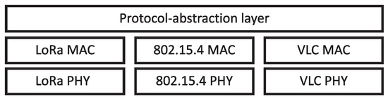 IEEE 802.15.7m is VLC’s current standard [5]. This standard defines both PHY and MAC, but is not well suited for IoT since it defines a super-frame structure that assumes bidirectional optical links. In this work, VLC has been introduced as a downlink-only technology in broadcast mode, and a easy custom packet structure has been defined (Figure 8). The potential applications of unidirectional VLC links in IoT are well-studied due to the ubiquity of luminaires and lighting infrastructures. In this work, the communication with an indoor static sensor is demonstrated. Despite this, the proposed hybrid architecture is capable of providing VLC connectivity in other scenarios in which RF is not feasible (or is severely affected by a harsh environment). These scenarios comprise underground (mining, tunnels, e.g.) [28,29] and underwater environments [30], hospitals [31], and industry. Another interesting feature derived from the integration of VLC within the proposed architecture is the inherent positioning capability of this technology, which has been extensively studied in the literature [32].