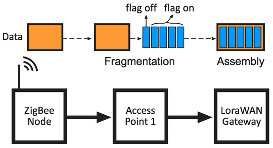 On the receiver side, the original frame is re-composed by concatenating all the incoming frames marked as fragmented, and finally adding the last one marked with the inactive flag. Figure 5 depicts the procedure in a ZigBee-to-LoRaWAN gateway communication.
