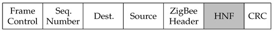 The ZigBee protocol uses the packet structure defined in the IEEE 802.15.4 standard (Figure 6). This implementation of IEEE 802.15.4 defines both PHY and MAC layers, and ensures the transmission between two endpoints with known MAC addresses. In this work, there is an asymmetrical network knowledge, as has been already explained. However, a specific HNF purpose to enable communication between nodes within the same ZigBee network has been defined.