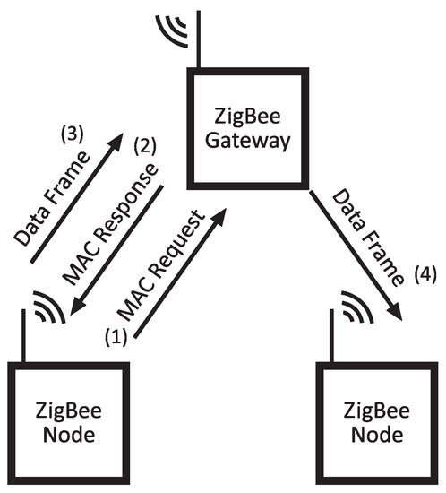 This purpose is the Data Frame (0x03), which concatenates the destination node ID and a variable length data field (1–47 bytes). Figure 7 graphs an example frame exchange diagram. In this figure, initial MAC request and MAC response packets have been included to illustrate the coordinator’s address discovery procedure.