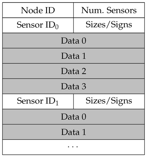 Node ID indicates the identifier of the data producer, which in this work corresponds to the ID stored by the ZigBee network coordinator. Num Sensors describe how many different sensor data are included in the frame. Sensor ID is the node’s internal identifier related to the sensor. The application layer will have the task of interpreting the type of sensor associated to this ID. The following field comprises 4 bits to indicate the sizes of each sensor data field, and 4 bits reflecting the signs of each one of them (positive: 0; negative: 1). Hence, the maximum number of sensor data allowed is 4. However, if fewer sensor data are being transmitted, the corresponding data fields set to 0x00 and the sign bit to 1 will show that there is no information.