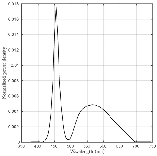Energy-normalized optical spectrum of the used VLC lamp. This measure was obtained using an integrating sphere with a 30 cm diameter and an optical spectrum analyzer (BTS256 LED tester).