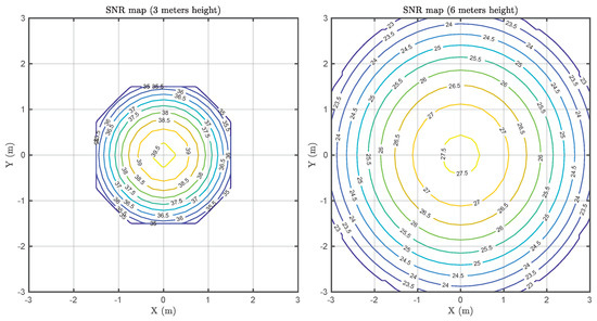 Signal-to-noise ratio (SNR) map at a 3 m height (left). SNR map at a 6 m height (right). In both cases, the receiver has been considered to point upwards.