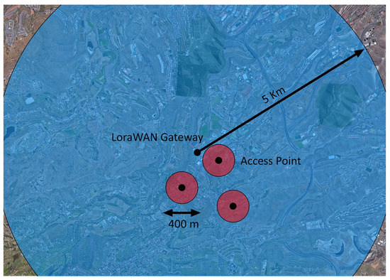 A coverage simulation using the Okumura–Hata model [36] for the LoRa protocol and the general urban path loss (GUPL) model for ZigBee [37] was carried out using the parameters of Table 3, where the experimental setup’s environment is assumed to be urban. The communication parameters were extracted from the nominal characteristics of the used components. The transmitter and receiver antenna heights are assumed to be similar to those used in an actual deployment (LoRaWAN gateway on top of a building and Access Points at street-light height). Figure 14 depicts the estimated coverage of the LoRaWAN gateway and several ZigBee coordinator nodes.