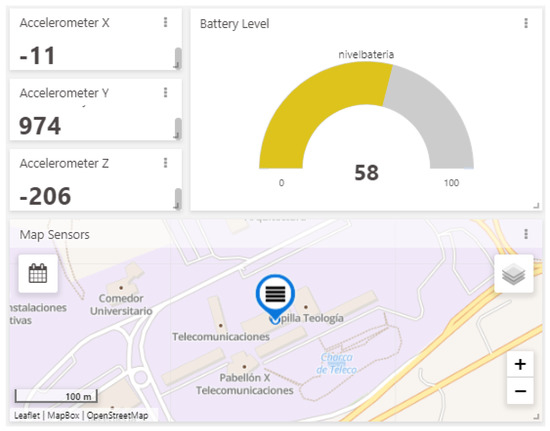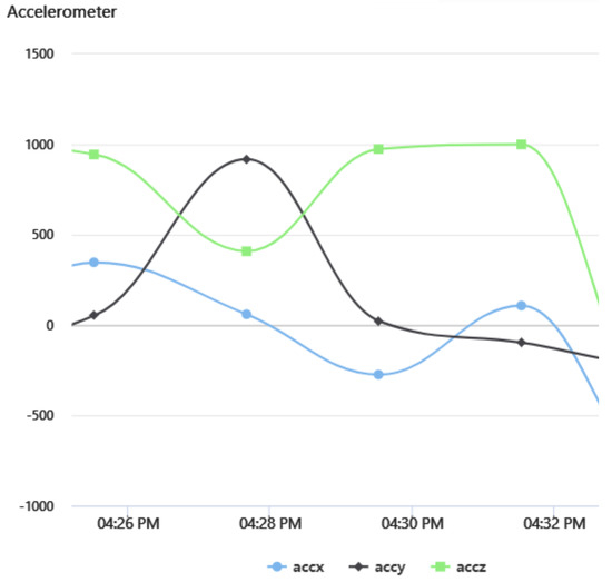 Figure 15 depicts the data on a dashboard built in the TagoIO service. Figure 16 shows the changes recorded by the accelerometer due to the movement of the sensor board, demonstrating both correct data acquisition and delivery by the hybrid network.