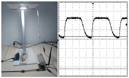 On the VLC communication side, as a first test, a small set of characters were sent from “The Things Network” platform with the objective of visualizing the appropriate changes in the receiver. An example of the signal recorded in the oscilloscope can be observed in Figure 17.
