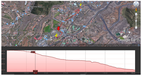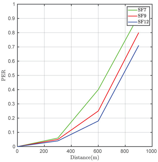 A total of 300 frames were sent at different distances in each test. The parameters employed for the LoRaWAN backbone were a bandwidth of 125 kHz and a spreading factor of 12. It is important to highlight that the tests were carried out in an urban area with a significant amount of buildings, and not in an open field without obstacles, which would have improved the obtained results (Figure 18). Moreover, the transmitter was located inside the laboratory, introducing an important indoor-to-outdoor additional loss. Figure 19 depicts the packet error rate (PER) versus the distance in this case. In an actual deployment in which the access point was anchored to a solar-powered LED luminaire, the SNR and hence the PER performance was considerably increased.