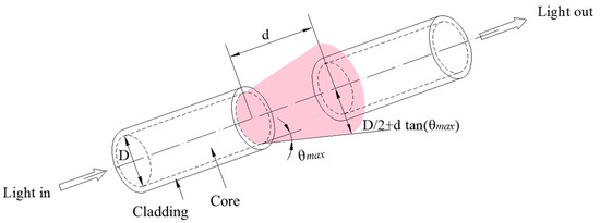 The basic principle of the proposed POFS mainly depends on the light intensity modulation with the distance change between the two cleaved plastic optical fibers. Here, the two cleaved glass fibers are secured by PTFE tubes to form the sensing gauge, and the separation of the cleaved ends varies. Hence, the light intensity in the circuit will be changed according to the distance in the tube when the structure deforms. The attachment of the PTFE tube to the cylinders, allowing displacement to be transferred to the sensor without loss, is critical. The relationship between d and intensity loss is well discussed in [30], and the operating principle is illustrated in Figure 3. The relative motion of the two-faced POFS renders the output light intensity variation. The relationship between the light intensity and the gaps of the POFS will be presented briefly as follows. Light emits from the source fiber, assuming that the energy distribution is homogeneous; its half-angle at the apex is denoted as θmax; D is the diameter of the fiber; d is the displacement to be measured; and the intensity loss is equivalent to the logarithm of the receiving fiber core area and the total area ratio, which can be given as: