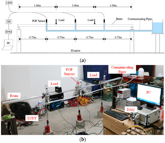 Experimental set-up of the deflection test: (a) the scheme for the employment of the POFS-based deflection monitoring system; (b) the installed system in the laboratory.