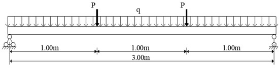 A four-point bending test is employed, with the step-loading imposed on the simple supported beam increased from 10 to 90 kN, with a 10 kN increase at each step. Figure 12 shows the load placement of the static load test. The proposed deflection monitoring system is installed on the beam, and a water container is deployed at a fixed point outside the beam. Cylinders and containers are connected by acrylic pipes, and water is applied as liquid injected inside the system. Three LVDTs, whose measure error is less than 0.001 mm, are employed to measure the deflection of the beam. The original displacement data, measured after the weights are placed at specific locations, are compared with the LVDT results later. The results are presented in Figure 13.