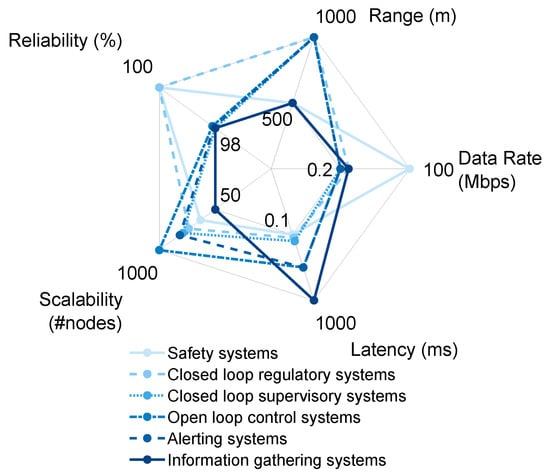 Wireless coverage of the entire industrial site may benefit classes 2–6, whereas class 1 requires a solution combining both ultra-high reliability, redundancy and ultra-low latency, which is infeasible with long range wireless considering the trade-offs. Performance requirements of different classes are depicted in Figure 3. For site-wide coverage, a range of at least a few hundred meters is needed. Site-wide coverage would enable multicasting measurements to several destinations, for example, actuators, supervision systems, databases, enabling the support of different services for several classes of industrial systems, making the network heterogeneous. Thus, site-wide IWSANs need to be scalable enough to accommodate new nodes and provide QoS, considering that they are expected to run for several decades. Different applications require different performance and services, as examples in Table 1 show.