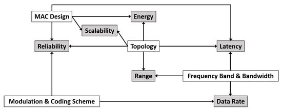 Latency is reduced by increasing the data rate, in turn enabled by more complex codings and larger bandwidths. Furthermore, multi-hop topologies increase the latency considering that forwarding and routing introduce additional delays. In addition, computing a new route when a link fails also introduces delay which can render multi-hop topologies useless in low-latency time-critical applications. Medium Access Control (MAC) design has a significant impact on latency as well, especially in IoT technologies where devices aim to sleep as long as possible to save energy, therefore delaying transmissions and receptions. MAC protocols can be classified into four classes: (1) Fixed Assignment Protocols where resources are divided among the nodes for a defined time duration, (2) Demand Assignment Protocols where resources are provided to a node on demand, (3) Random Access Protocols where resources are divided randomly and (4) Hybrid Protocols that combine fixed or demand assignment with random access. Fixed Assignment Protocols such as Time Division Multiple Access (TDMA) introduce determinism and achieve lower latency than random access protocols under very high load, but under low load they waste resources by inefficient usage of the channel time, where random access protocols achieve lower latency. Demand-based protocols are not suitable for low-latency time-critical communications given that explicitly asking for resources every time takes up bandwidth and adds up to latency. For heterogeneous industry applications, hybrid approaches are the most promising given that they aim to combine the benefits of both fixed assignment and random access protocols, while surpassing their limits at the same time and adapting to the network conditions. In addition, retransmissions need to be kept a minimum as they also increase the latency.