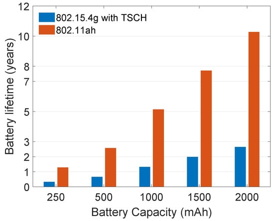 Wi-Fi HaLow is significantly more energy efficient than 802.15.4g with TSCH. This improvement is due to the higher supported data rate that leads to shorter transmission times. This result is also reflected in the predicted battery lifetime shown in Figure 5. Given a sufficiently large battery of 2000 mAh, the lifetime of Wi-Fi HaLow is expected to be above 10 years for a 10-min transmission interval, without battery replacement. For 802.15.4g, battery life expectancy is under 3 years in the same scenario. For the long-range contenders, it is under a year, as shown in Figure 6b, except the LoRaWAN sf7 that can live up to 7.5 years (cf. Figure 6a). The compared configurations of 802.15.4g and 802.11ah do not represent the best case scenario regarding energy consumption, as both technologies are configured to use low data rates. However, the chosen settings result in similar coverage range. In a line-of-sight scenario, 802.15.4g FSK-50 reaches a good PDR up to 700 m, while FSK-200 goes up to 420 m [62]. For 802.11ah [63], mcs10 (150 kbps) has a range of 700 m to more than 1000 m. For a higher data rate, 802.15.4g will achieve better energy efficiency but it’s achievable range would be very different from that of mcs10 of 802.11ah. Similarly, 802.11ah will achieve better energy efficiency for higher data rates (mcs10 represents the lowest possible data rate and thus the worst case).