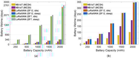 It is important to note that the shelf life also affects the battery life. The lifetimes illustrated in Figure 5 and Figure 6 represent the ideal cases which only take into account the consumption of a radio and a microcontroller. Hence, the presented results do not take into account energy consumption of peripherals, self-discharge of battery nor other power drains. For example, when considering only radio and microcontroller, NB-IoT platform using mcs4 and mcs9 would need around 230 mAh and 155 mAh respectively to run for three years. For the same time period, LoRaWAN radio and microcontroller using SF7 and SF12 would consume 8 mAh and 47 mAh, when ignoring other power drains and employing sleep mode (45 mAh and 83 mAh with idle mode). However, the above mentioned factors need to be taken into account when estimating very long battery lives as they make the largest part of energy consumption over a long time.