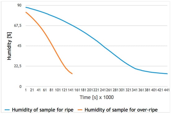 The humidity of raw material was controlled during the whole process of drying with software that is used to back up the process of drying raw materials. After finishing the process, the final humidity of the raw material was verified with a moisture analyzer. The initial value of the humidity of the research material of the ripe class was 87.3%, and in the case of the over-ripe class, this equaled 82.7%. As a result of convection drying, the humidity of the research material was reduced to the level of 14% for both classes (Figure 1) [].