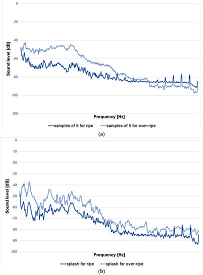 Samples of three acoustic spectra showing the level of sound intensity for dried strawberry fruits representing the ripe and over-ripe classes, with the following methods: (a) splash batch of five fruits, (b) splash batch of one fruit (the fruit lands in a glass filled with water), (c) squash batch with one fruit.